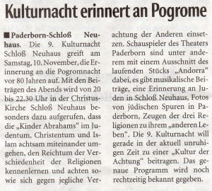 Die jährliche Kulturnacht Schloß Neuhaus greift 2018 die Erinnerung an die Pogromnacht vor 80 Jahren auf, mit der den jüdischen Bürgerinnen und Bürgern jegliche Achtung abgesprochen wurde, was schließlich zu deren Vernichtung führte. Mit den Beiträgen des Abends wird dazu aufgerufen, dass die „Kinder Abrahams“ in Judentum, Christentum und Islam achtsam miteinander umgehen, den Reichtum der Verschiedenheit der Religionen kennenlernen und achten, sowie sich gegen jegliche Verachtung der Anderen einsetzen. Schauspieler des Theaters Paderborn rezitieren dazu u.a. die Ringparabel aus „Nathan der Weise“, es gibt Klezjazz, eine Erinnerung an Juden in Schloß Neuhaus und Fotos von jüdischen Spuren in Paderborn. Zeugen der drei Religionen stellen in kurzen Beiträgen ihr „anderes Leben“ dar, dem eine Darstellung dazu folgt, warum Menschen dieses oftmals nicht akzeptieren können.