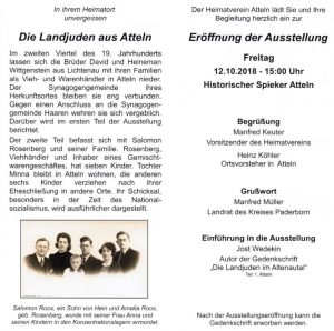 Ausstellung: Die Landjuden im Altenautal. Wittgenstein und Rosenberg – zwei jüdische Familien aus Atteln. Zweite Station der oben genannten Ausstellung.